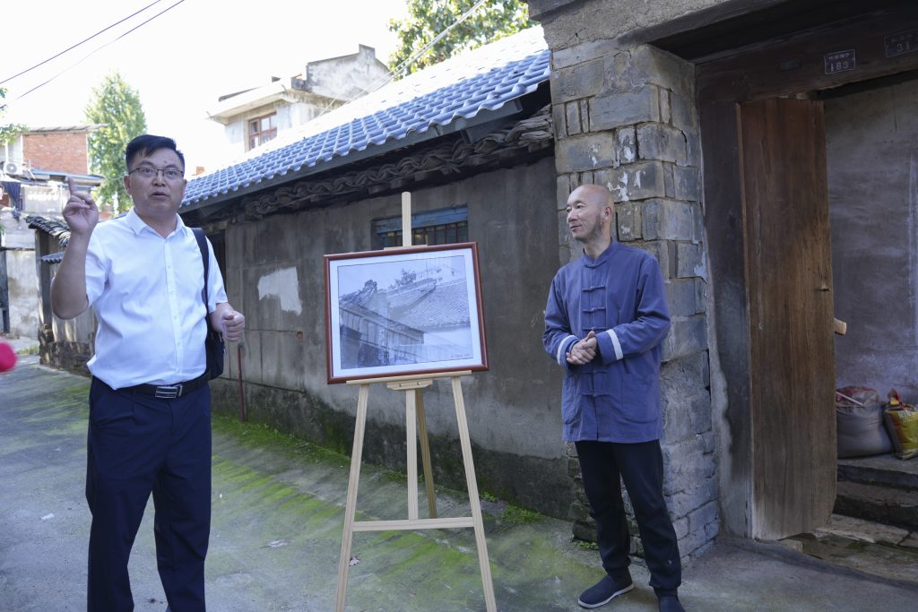 在中山街129号传统历史文化建筑现场踏勘期间,市名城办科长曹耿和建筑学会理事长白晓雨为中山街129号历史建筑保护修缮公示牌揭牌。曹耿宣读了市住房和城乡建设局、市文化和旅游局关于保护修缮批复文件。学会历史建筑保护传承专委会委员谢三对建筑现状及获批保护修缮方案做详细介绍。