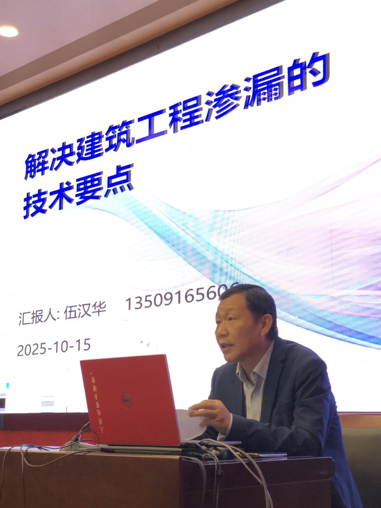 在专题学术研讨环节,两位行业资深专家带来了精彩纷呈的学术讲座。正高级工程师、中国建筑学会建筑防水学术委员会副主任、中国工程建设标准化协会标准审查专家、CECS防水防护与修复专业委员会专家常务委员、中国硅酸盐学会防水材料专业委员会防水专家、西牛皮防水科技有限公司副总经理伍盛江围绕 “建筑防水应用技术”作了高水平的学术报告。伍盛江专家从建筑防水技术的发展历程和国家标准、行业发展趋势入手,介绍了国内外先进的防水技术和理念,强调了标准化在建筑防水工程中的重要性,分享了先进的防水体系、新材料与新工法的应用,为与会者带来了前瞻性的技术视野。高级工程师、国家一级注册建筑师、汉中市建筑学会建筑防水专委会主任委员、汉中鼎汉建勘设计院有限公司建筑总工、设计室主任伍汉华围绕“解决建筑工程渗漏的技术要点”,结合本地工程实践,深入剖析了渗漏问题的根源,并从设计、选材到施工等关键控制环节对《汉中市建筑防水技术规程》进行了解读。