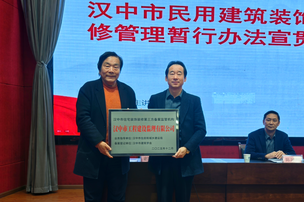 汉中市建筑学会理事长白晓雨现场宣布了经审核确定的第三方监管单位名单。白晓雨理事长向入选的第三方监管单位— —汉中市工程建设监理有限公司总经理魏涛颁发了“第三方监 管单位”牌匾。由此标志着我市装饰装修行业第三方监管机制 正式启动,通过引入第三方监管模式,构建“政府监管+行业 自律+社会监督”的多元治理体系,切实保障工程质量与消费 者权益。